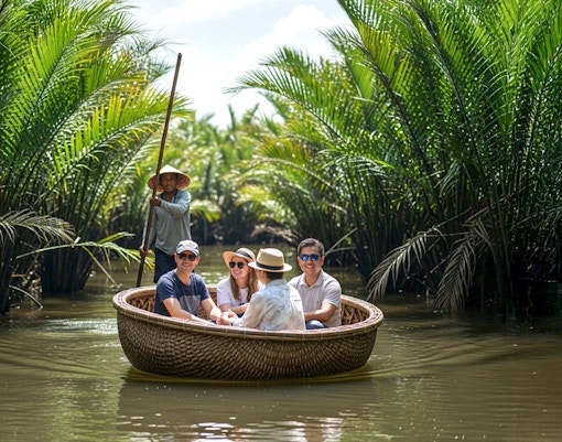 Le iconiche barche a cesto rotonde che scivolano attraverso un labirinto di palme nipa, il modo più sereno per esplorare le vie d'acqua nascoste di Cẩm Thanh.